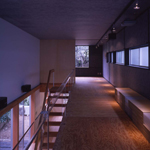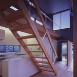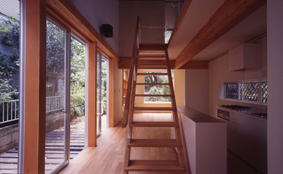 土地・建物合わせた総予算3000万円にどうプライオリティを付けながら住宅を建てていくかを探った東京近県の住宅。1年間かけて探した土地に、外周部に1間ピッチで柱を建てた在来木造2階建てとして、内部はT字に集成材の梁を掛けた。吹抜部はアクリルで手摺りをかけ、壁はリサイクル材料、床は野地合板のままとして、他者の目からはアンバランスなコストの材料とクオリティが住み手にはコンパクトにフィットするデザインとなった。